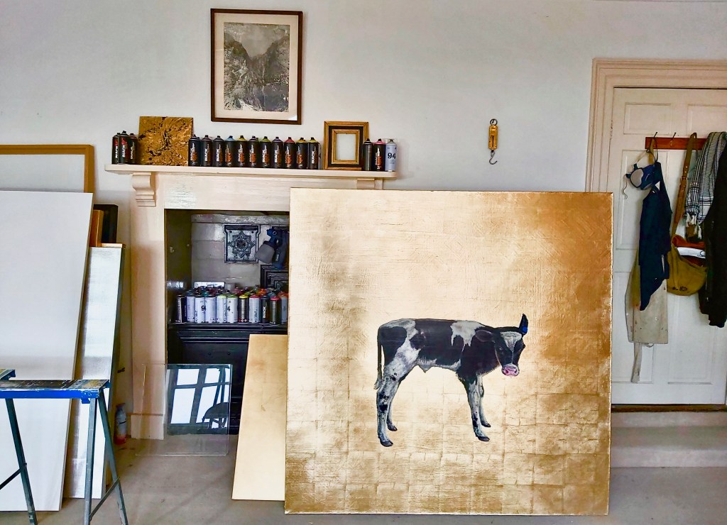 large painting of a life size Holstein Bull calf on a ground of gold leaf.