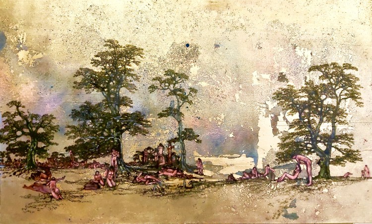 Rainbow Dove, Oil/gold leaf on panel, 1500cm x 1500cm. sold.Bathers, Oil, Acrylic and gold leaf on canvas, 152cm x 191cm